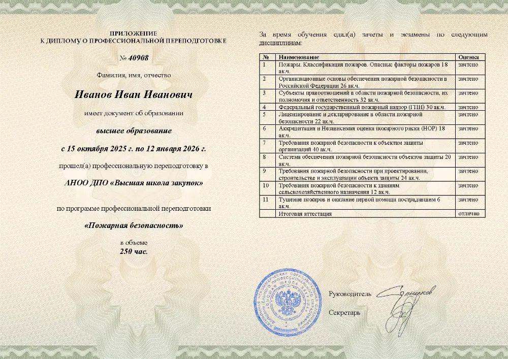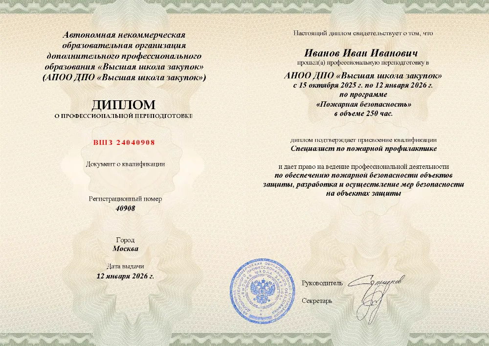 Профессиональная переподготовка, 250 академических часов, 11 модулей: организационные основы и законодательство в области пожарной безопасности, лицензирование и надзор, требования к объектам защиты, проектирование, тушение пожаров и оказание первой помощи пострадавшим. Онлайн-обучение в в Калуге с итоговой аттестацией.