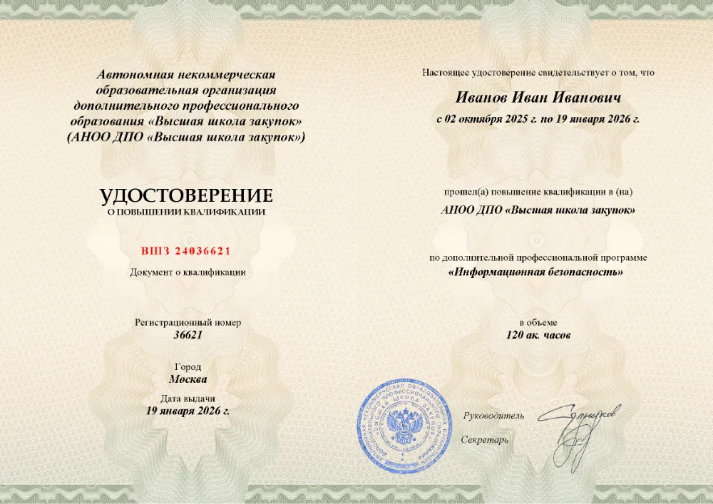 Повышение квалификации, 120 академических часов, 17 модулей: понятие, угрозы и законодательство в сфере ИБ, стандарты и управление рисками, административные и технические меры защиты, криптография, идентификация и обеспечение доступности. Онлайн-обучение в в Калуге с итоговой аттестацией.