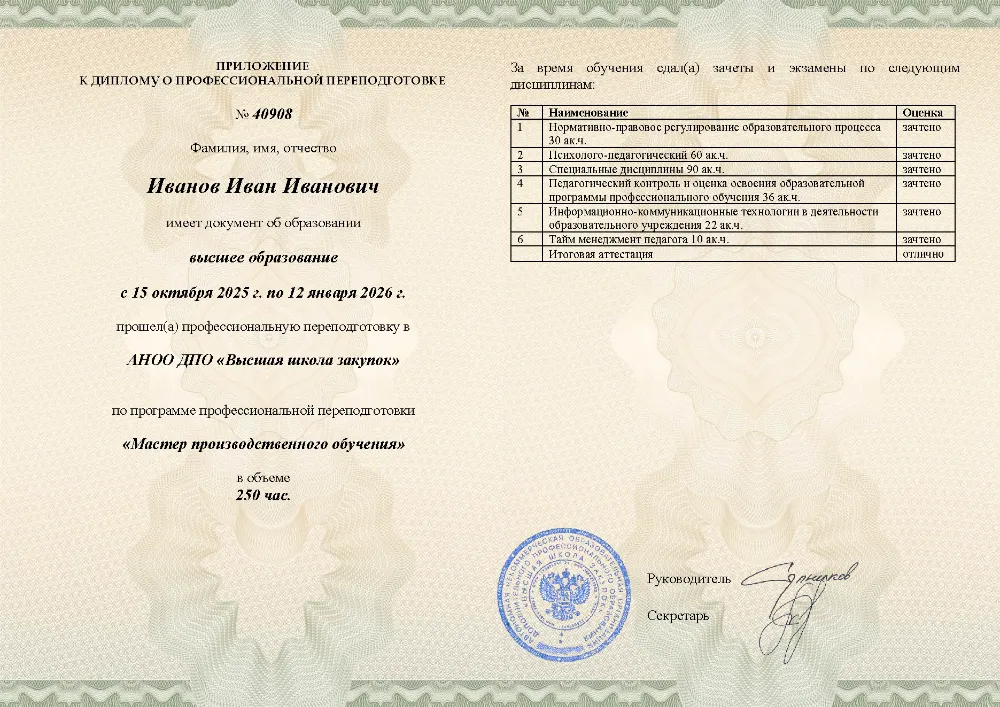 Профессиональная переподготовка, 250 академических часов, 11 модулей: нормативно-правовое обеспечение, основы педагогики и психологии, проектирование образовательных программ, методика профессионального обучения, педагогический контроль, применение ИКТ и тайм-менеджмент педагога. Онлайн-обучение в в Калуге с итоговой аттестацией.