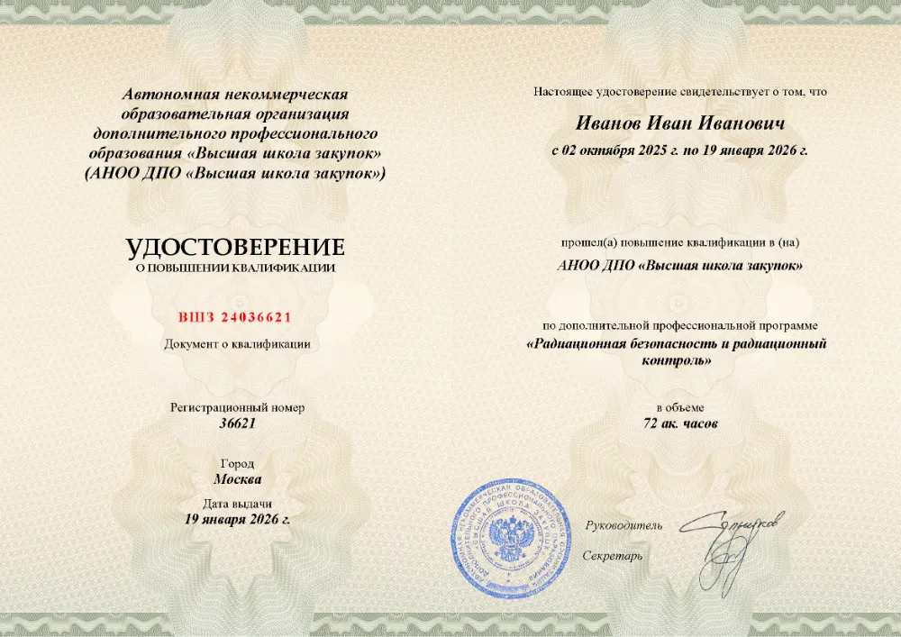 Повышение квалификации, 72 академических часа, 7 модулей: правовые и организационные основы деятельности, физические основы РБ и дозиметрия, учет РАВ и РАО, организация производственного контроля, обеспечение безопасности и физической защиты, документационное обеспечение и подготовка персонала. Онлайн-обучение в в Калуге с итоговой аттестацией.