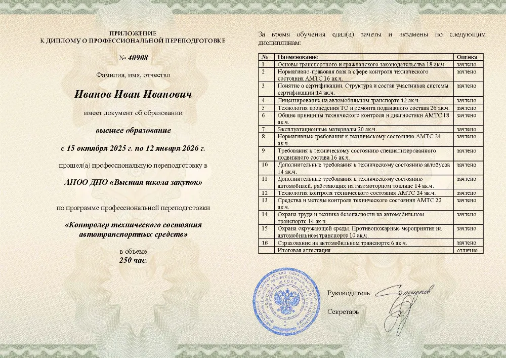 Повышение квалификации, 72 академических часа, 4 модуля: нормативные требования к техническому состоянию транспорта, технология и методы контроля, оценка состояния специализированного подвижного состава и автобусов, охрана труда и техника безопасности. Онлайн-обучение в в Калуге с итоговой аттестацией.